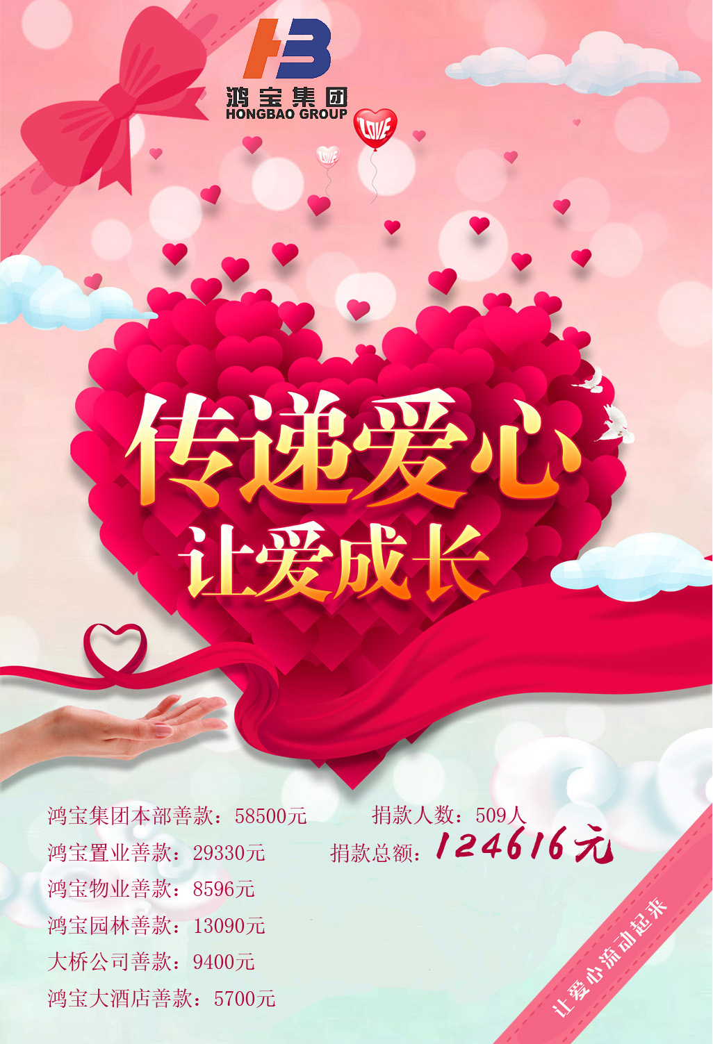 人間自有真情在。倡議發(fā)出后,得到鴻寶集團及各個成員企業(yè)的積極響應(yīng)。公司領(lǐng)導帶頭捐款,每一位鴻寶人都慷慨解囊,自發(fā)捐出一份愛心,用真情匯聚成一股戰(zhàn)勝病魔的正能量。據(jù)統(tǒng)計,在倡議發(fā)出的一周時間內(nèi),共為寇小四同志募集愛心款124616元,捐款人數(shù)達到509人。聚鴻寶之愛心,送人間之溫暖,募集的每一份款項都承載著鴻寶人的祝福與希望,體現(xiàn)的是鴻寶大家庭濃濃的關(guān)懷之情。