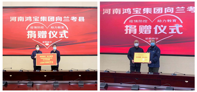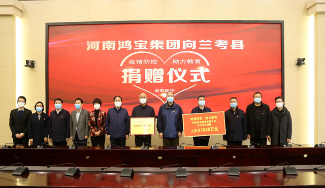 2020年2月12日,在新冠肺炎疫情防控的關(guān)鍵時期,河南鴻寶集團(tuán)有限公司黨委書記鄧和平、副總裁劉英、總會計師劉秋花和總裁辦公室同志前往蘭考縣,舉行“疫情防控·助力教育”愛心捐贈活動,向蘭考縣捐贈人民幣1000萬元,用于支持當(dāng)?shù)氐慕逃畔⒒ㄔO(shè),以減輕疫情對農(nóng)村孩子受教育的影響。