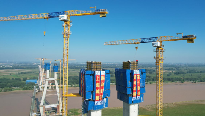 蘭封高速東壩頭黃河大橋主橋全長9104米,主橋采用主跨140+360+360+140米的鋼混組合梁三塔斜拉橋設計,塔柱外形為中原鼎型結構,主橋中塔89#墩高達160.5米,分27個節(jié)段進行澆筑;兩座邊塔88#墩、90#墩均為154.3米,分26個節(jié)段進行澆筑。歷經12個月的日夜奮戰(zhàn),蘭封高速黃河大橋88#墩主塔26個節(jié)段的施工任務提前兩個月完成。
