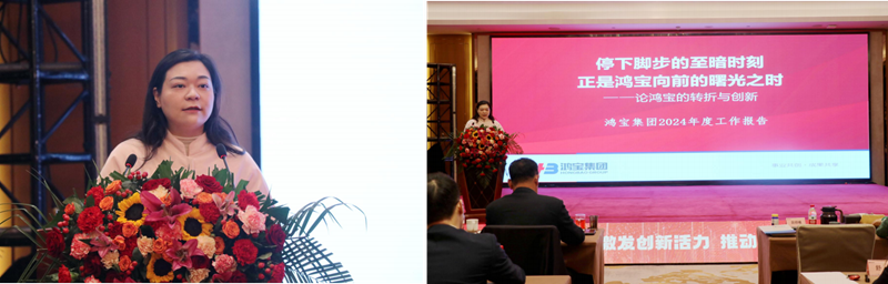 在認真聽取各位高管領導的總結發言后,集團總裁袁曉曦以 《停下腳步的至暗時刻,正是鴻寶向前的曙光之時》為題發表鴻寶集團 2024 年度工作報告。曉曦總從新時代的勢、鴻寶的轉折、 2024 年度工作總結、穿越自我周期找不足、2025 年度工作目標 等五個方面對鴻寶集團發展的時代環境、戰略定位、工作成績、 問題不足與發展目標等進行了深刻、系統、全面的總結剖析。